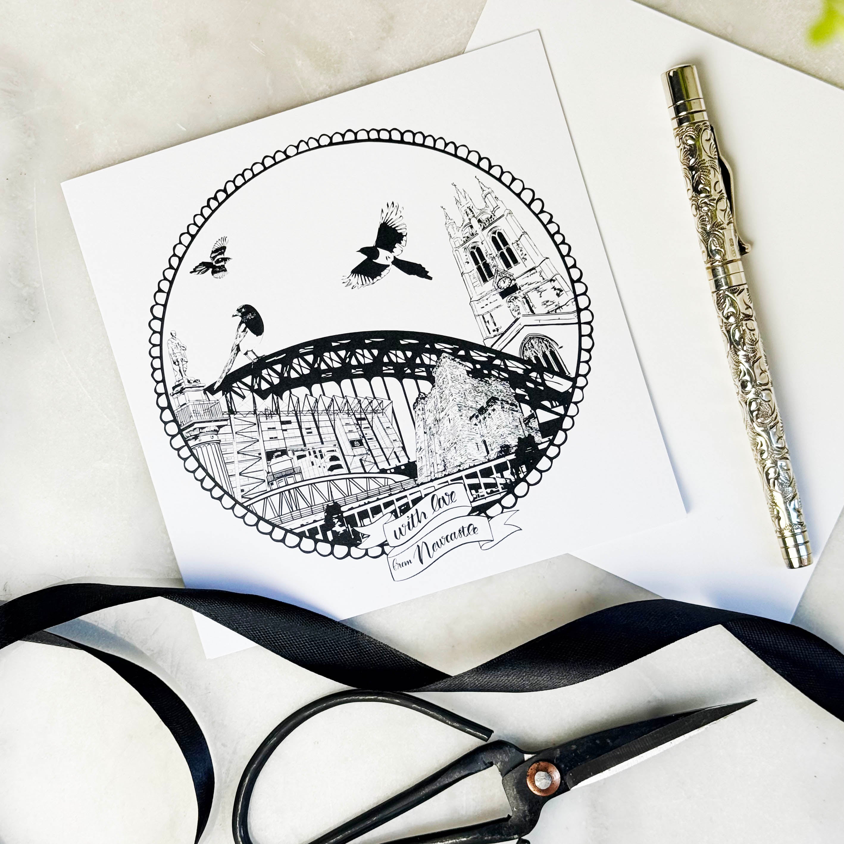 My new Newcastle card features some of my favourite landmarks including The Tyne Bridge, Newcastle Cathedral, the Castle Keep, Greys Monument, River Tyne Bridges, St James’ Park and three iconic magpies.